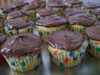 Anyway, in the cake department, he likes coconut cake and yellow cake with chocolate icing. Last year I made a yellow sheet cake with chocolate icing, but this year I wanted to do cupcakes instead. (Disclaimer: Please keep in mind that I am no cake decorator by any stretch of the imagination (obviously), but at least I tried.)