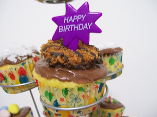 How yummy.I want to eat one of those cupcakes SO BAD right now. I LOVE the top cupcake with the somoa and candle. How clever!!