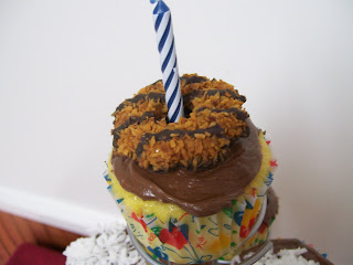 For the cupcake that would go at the top and center of the cupcake tree, I topped it with a Samoa Cookie and stuck a candle in the middle. My husband loves those cookies!