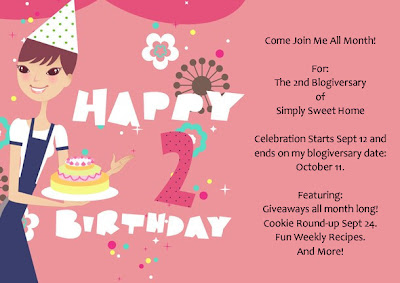 On October 11, I’ll be celebrating my 2 year blogiversary! And I’d like to invite everyone to come and celebrate with me. Starting September 12 and going through October 11, I’ll be hosting some awesome giveaways! I’ll also be featuring my weekly recipes as usual and my Sweet Thursday Cookie Round-Up is on Sept. 24. And I’ll be featuring some fun party ideas and much more! I hope everyone will join me for this event!