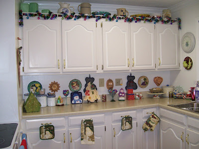 After Christmas last year I bought some new garland and balls to put over the cabinets. It really adds a lot of color….and fun to the room. (Note all the snowmen items hanging from the drawers above and the snow men towels hanging on the stove below…not to mention a couple of snowmen on the counter.)