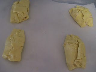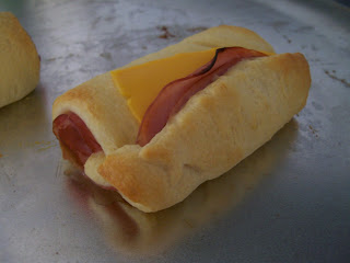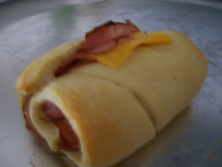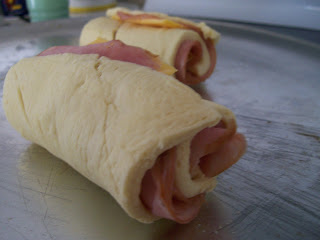Directions: Pull crescents apart. There should be 8 triangles. Put two of the rolls together so that it makes a rectangle shape. Use your fingers to press the two rolls together. Repeat with the rest of the rolls. Mix up your mayo and chicken. Spoon out some of the chicken mixture onto the roll. (see pic below) Then roll the dough up into a pocket. Press the dough again with your fingers to make sure the pocket is sealed. Bake according to the instructions on the crescent roll package.