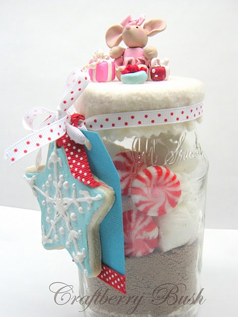 This mousey sits on top of what’s suppose to be a jar of layered cookie ingredients.