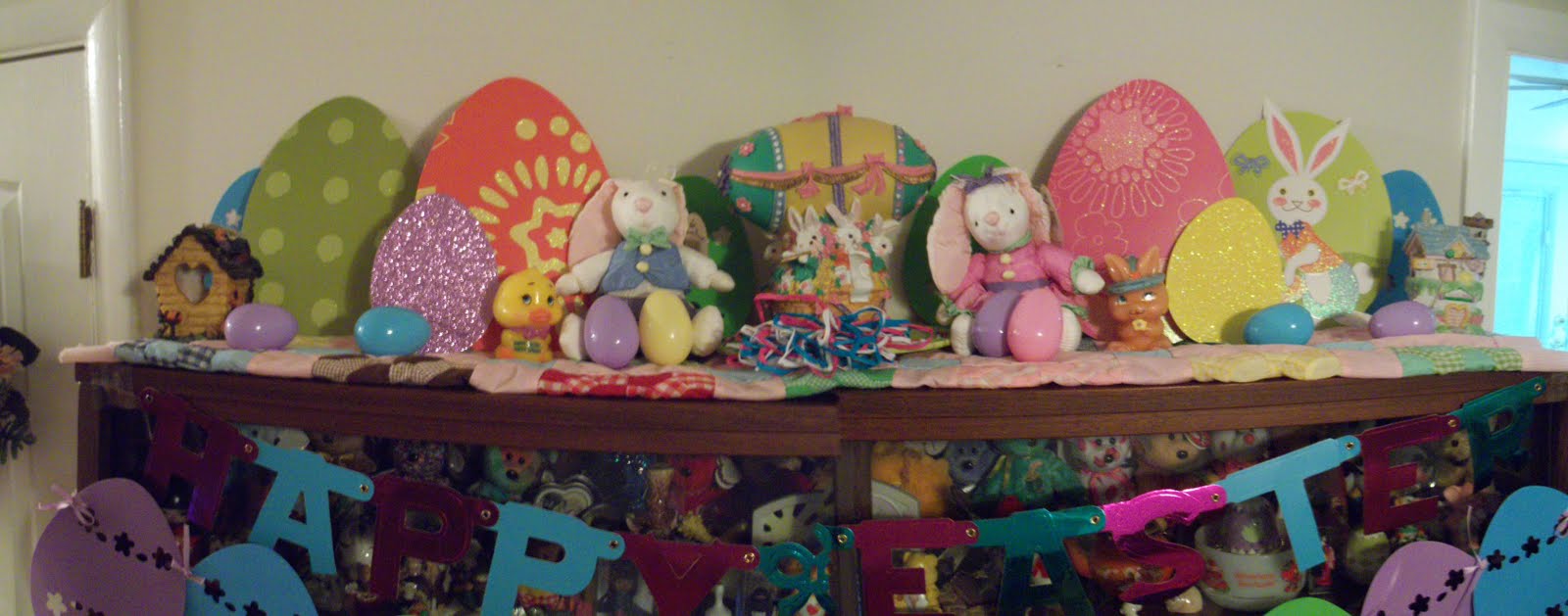 This is on top of the fridge. I used a pink runner, and then in the center, there is a flower adorned wishing well with a glittery Easter sign.