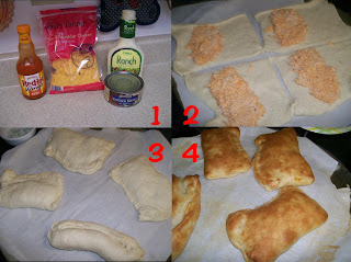 Directions:  Drain the water off your chicken.  Place in a small bowl.  Add buffalo sauce and ranch dressing.  I didn’t meausure;  I just put a little of each end.  The amount will depend on just how spicy you want the calzones to be.  (Just keep  in mind that you want the mixture to be of the same consistency of a tuna or chicken salad, not runny.) Next add your cheese.  Again, I just threw some in.  I’d say it was about 1/3 or 1/2 cup.  Mix well.